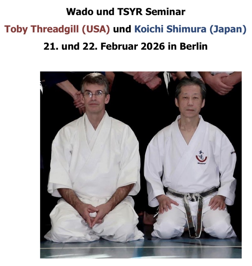Darum folgten am 21. und 22. Februar in Berlin Eric, Ivo, Frank und Thomas den Ausführungen und praktischen Übungen von Toby Threadgill (USA – Kaicho und Menkyo Kaiden Takamura ha Shindo Yoshin ryu) und Koichi Shimura (Japan – 8.Dan JKF Wado-Kai, JKF Wado-Kai 1st Instuctor)