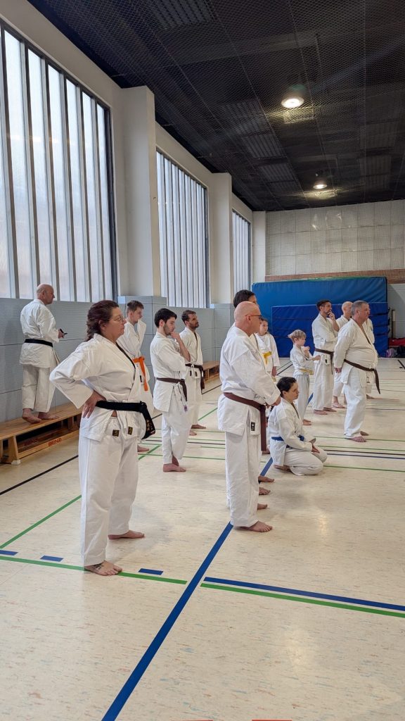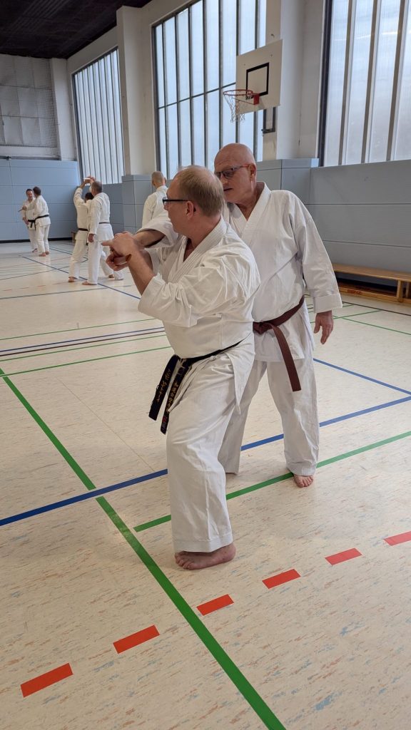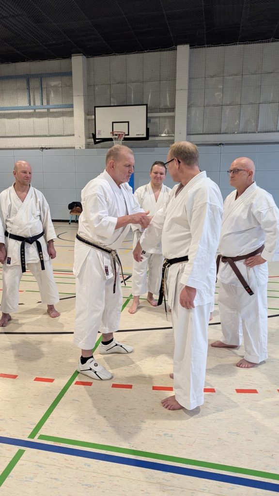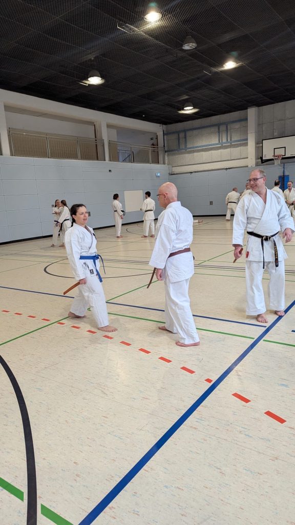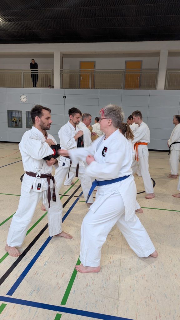 Um uns ordentlich auf Betriebstemperatur zu bringen, sorgte Leandro für eine musikalische Erwärmung – natürlich kombiniert mit Ausdauer, Kraft, Karate und Dehnung. Danach übernahm Carsten aus Meißen das Zepter und schulte uns in Partnerübungen zu Abstand und Timing, angelehnt an die Ohyo 3.